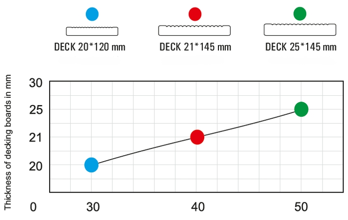 Do not place support beams directly on the ground. The substructure should be positioned on water-resistant pads or pedestals. Adjustable pedestals ensure free water drainage beneath the beams during rain and allow for leveling of height differences. The distance between pedestals should be approximately 50 cm for standard terrace loads. Plan the terrace slope lengthwise away from the house so that water can freely drain from the surface. To increase the durability of the support beams, use protective beam strips from our product range or treat the wood with an appropriate impregnation. For better airflow between the board and the support beam, ventilation pads can be used. Do not use softwood beams for terraces made of hard tropical wood. Proper spacing of the substructure beams is essential — see the table below for recommended distances.