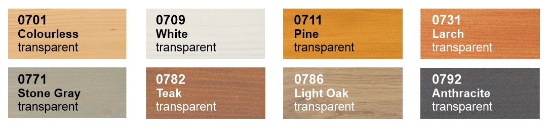 The colour result depends on a range of factors. Aside from the wood type and quality, for example, the groundwood pulp is also important. For these reasons, we recommend a trial coat on the original wood so that you can be sure that you are getting the right shade. Colour pigments with high UV resistance (except colour-free shade) ensure the natural beauty of the wood.
